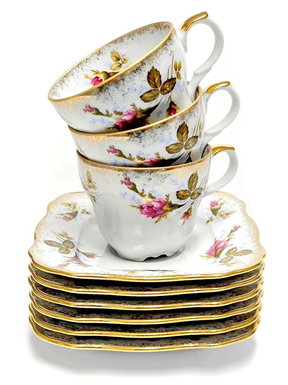 Dekoracja wykonana ręcznie z użyciem kalkomanii naszkliwnej oraz złota, serwis przeznaczony do mycia ręcznego.